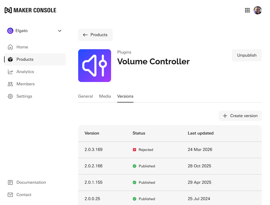 To submit a revision, log into Maker Console, select Products and the product you wish to revise, and then the Versions tab.